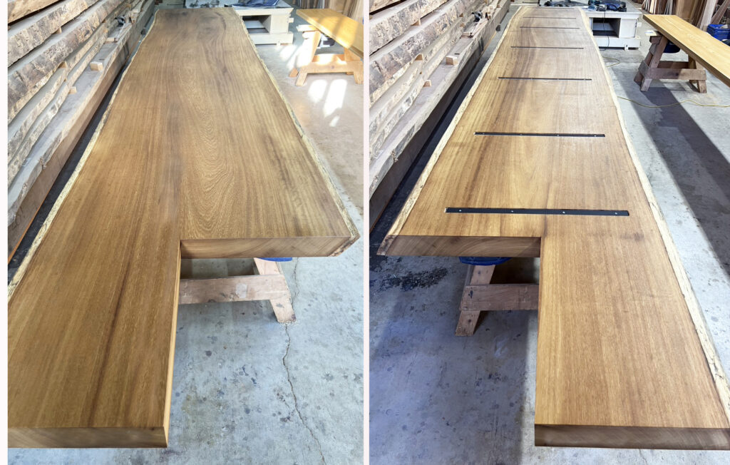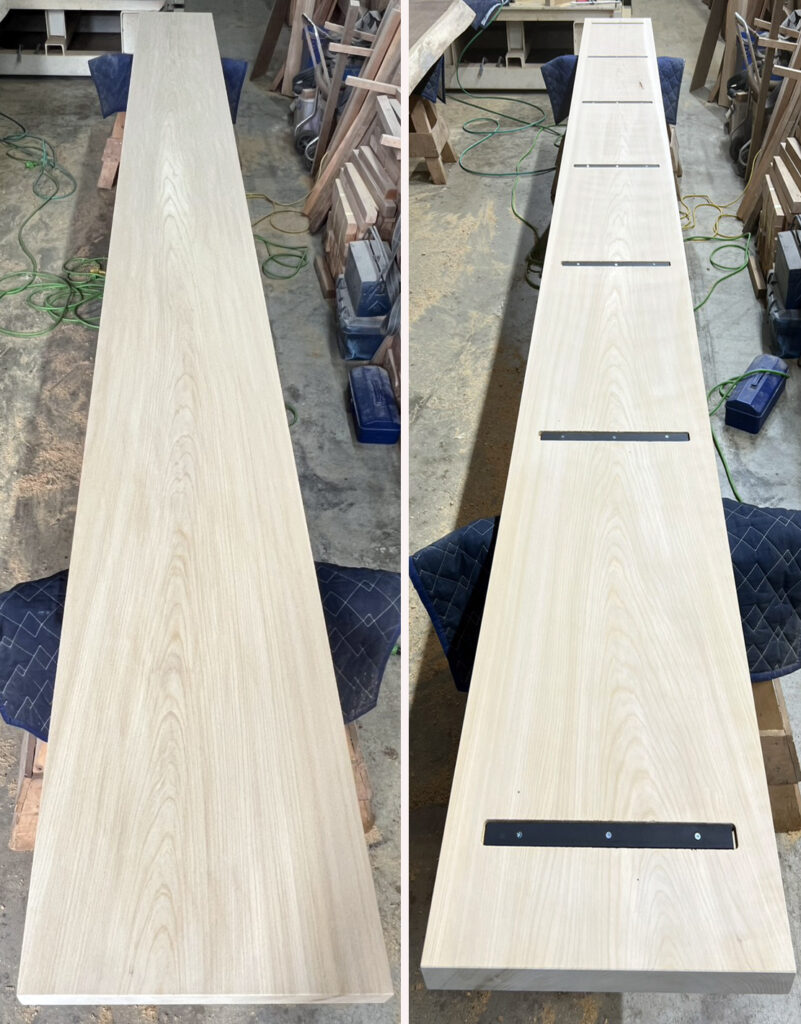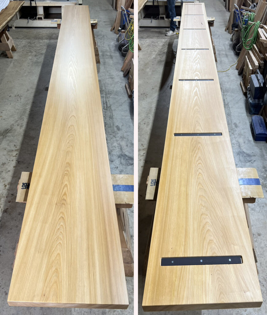 イロコの幅広材を加工しました。木口に切り欠きしております。裏面使いで出来るだけ広くの希望で東京恵比寿のフランス料理店として見に来て頂き即決でした。6000×1200~