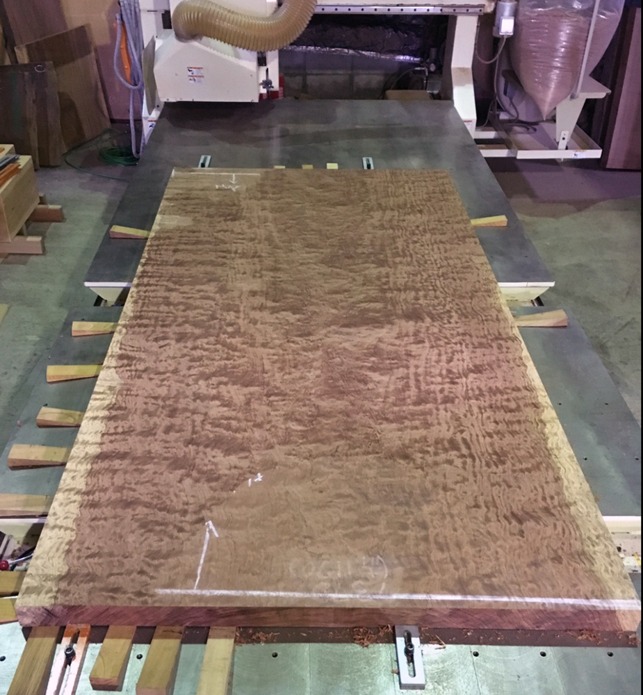 今日は、タモの玉杢の綺麗な両耳付きカウンターが削り終え明日ウレタン塗装です。
